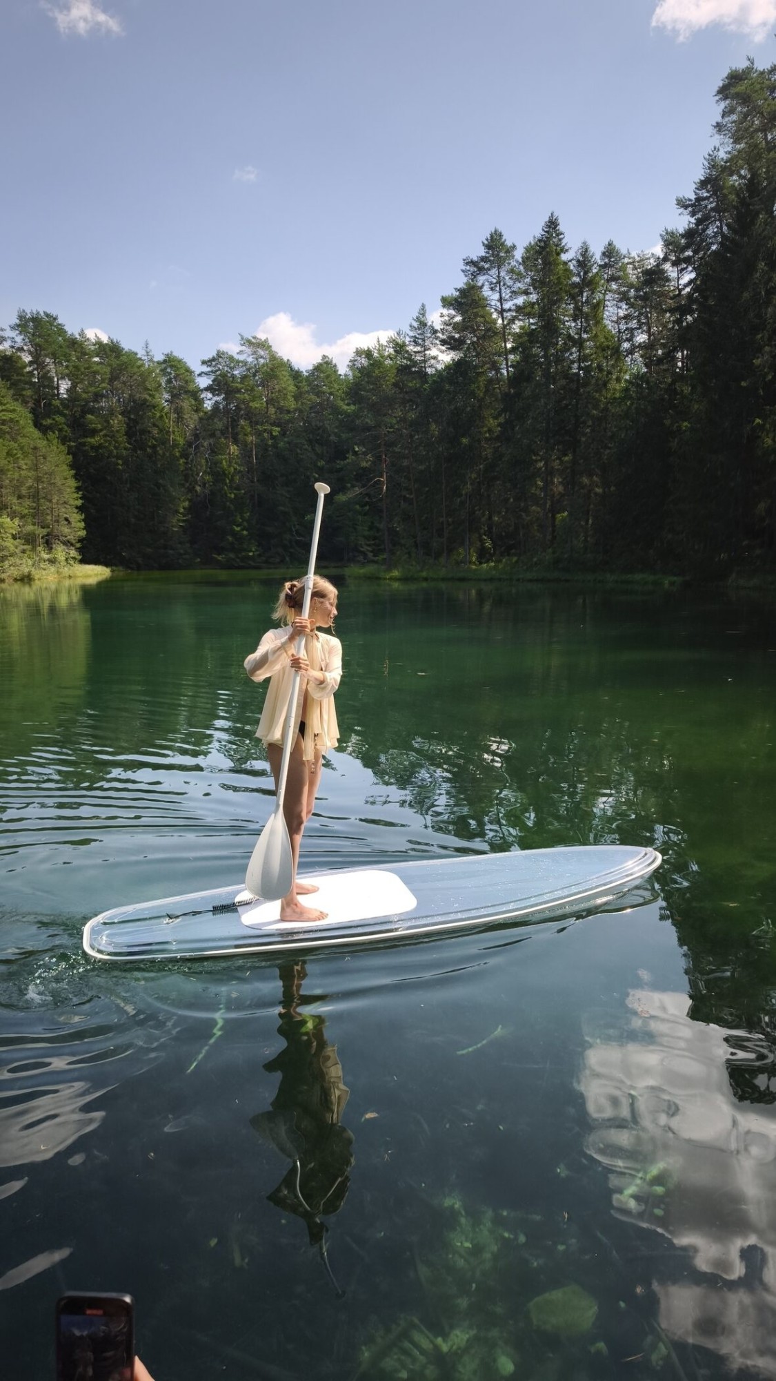 Впечатляющий вид под воду озера Синиярв с прозрачной SUP-доски для двоих — это подарок, который объединяет движение и красоту природы — момент, когда вы стоите над водой, и мир открывается у ваших ног.